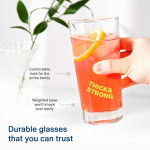 • CLASSIC AND MODERN DRINK GLASSES - These timeless highball glasses will complete any dinner table or home bar. These 4 piece glass tumblers have a heavy base and rounded rims which make them substantial to hold and comfortable to drink from.